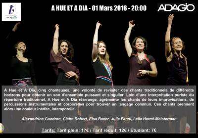 Loin d’une interprétation puriste du répertoire traditionnel, A hue et à dia réarrange, agrémente les chants de leurs improvisations, de percussions instrumentales et corporelles pour trouver un langage commun. Ces chants prennent alors une couleur inédite, intemporelle.Alexandrine Guedron, Claire Robert, Elsa Bader, Julie Fandi, Leila Harmi-Meisterman.