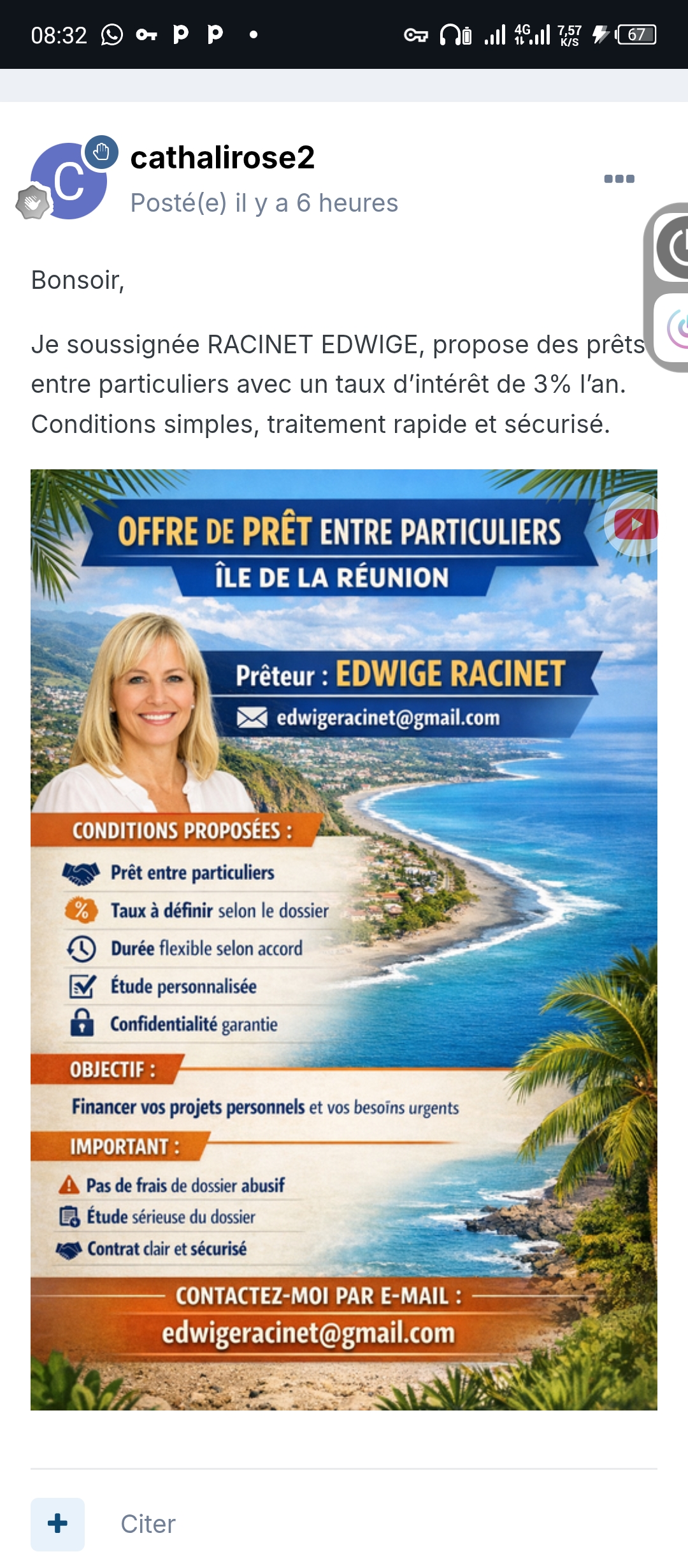 Je soussignée RACINET EDWIGE, propose des prêts entre particuliers avec un taux d’intérêt de 3% l’an. Conditions simples, traitement rapide et sécurisé.