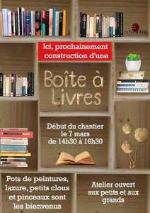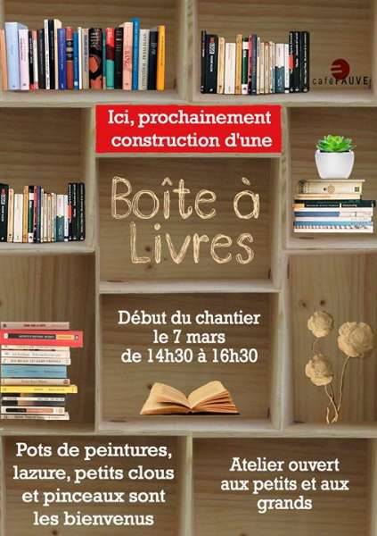 Bricolage de la nouvelle boîte à livres au Café Fauve qui annoncera le lancement d’un échange de livres.