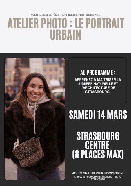 Rejoignez Julie et Jérémy, le duo de photographes du studio L'Art Subtil, pour une matinée d'initiation en plein cœur de Strasbourg. Loin de la théorie barbante, c'est une balade photographique pratique.
