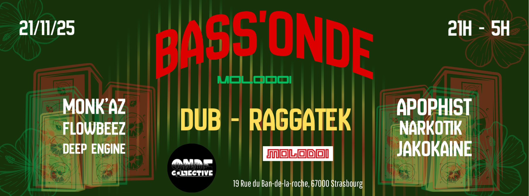 Le 21 novembre, de 21h à 5h, rejoins-nous pour une nuit immersive où dub et raggatek se mêlent dans une tempête de basses, de rythmes tribaux et de vibrations positives.
