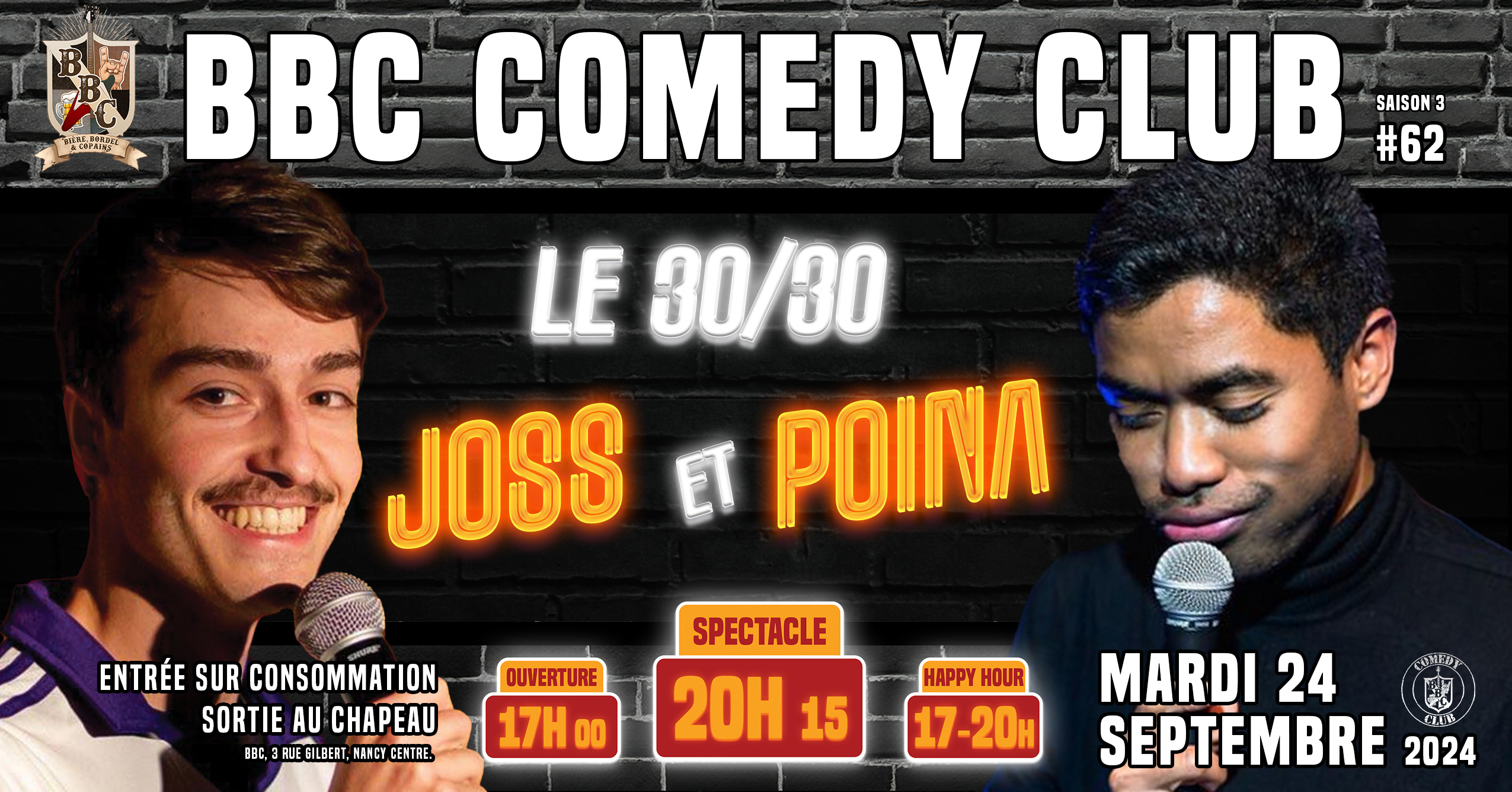 ? On vous prépare un 30/30 spécial avec Joss et Poina. Deux humoristes, deux univers, 30 minutes chacun pour vous faire pleurer de rire ! C’est le genre de soirée où il vaut mieux s’étirer les zygomatiques avant de venir !
