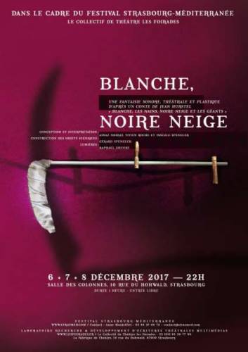 A 22h00, le Collectif de Théâtre Les Foirades présente « Blanche, Noire, Neige » une fantaisie sonore, théâtrale et plastique d’après un conte de Jean Hurstel « Blanche, les nains, noire neige et les géants » conçue et interprétée par Ainaz Nosrat, Vivien Roche, Pascale Spengler. Raphael Siefert (lumières), Gérard Spengler (fabrication des objets scéniques ) Durée 1h. Entrée libre.