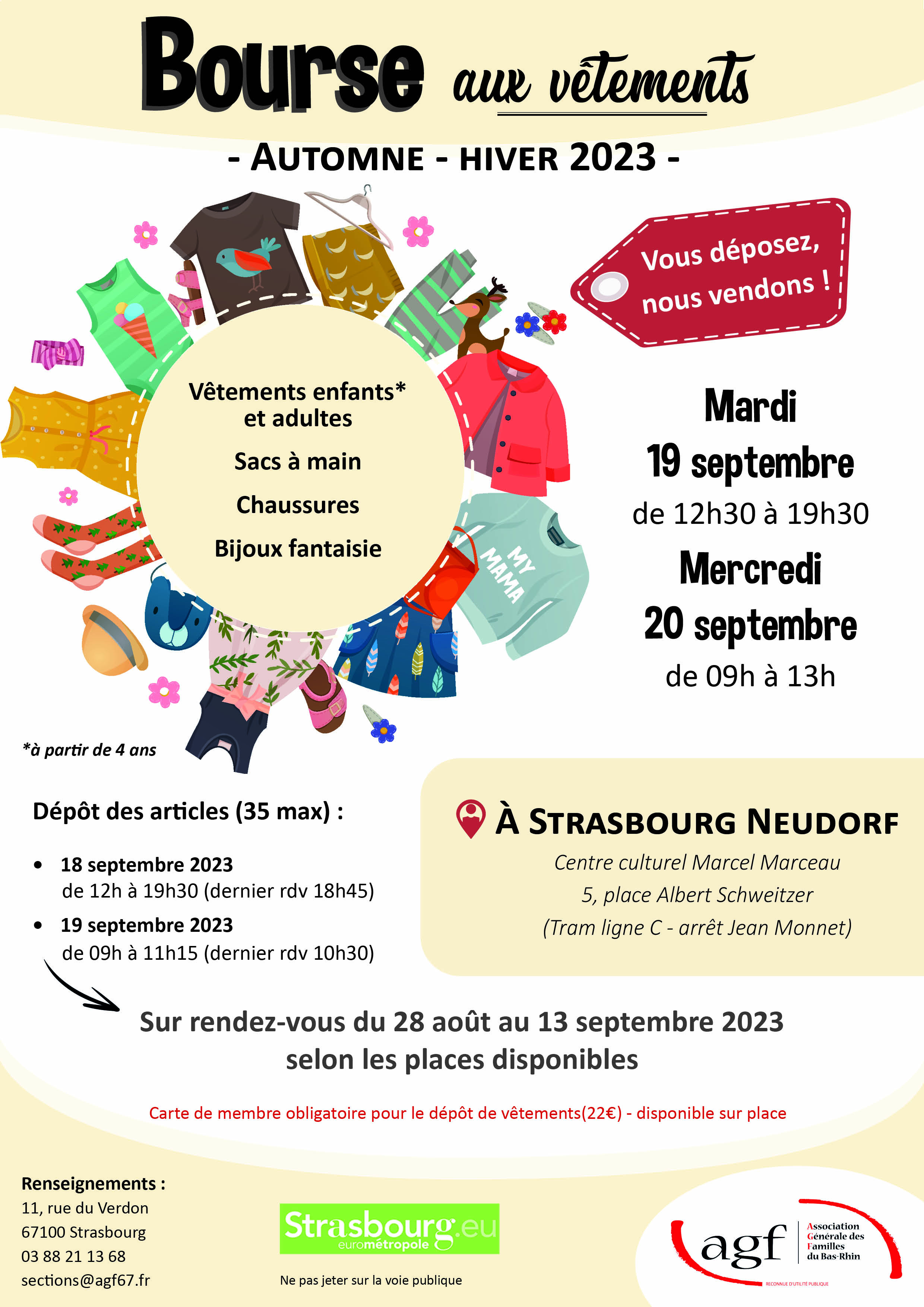 Dépôt des articles le 18 septembre 2023 de 12h à 19h15 et le 19 septembre 2023 de 09h à 11h15. Le dépôt des article se fait par prise de rendez-vous du 28 août au 13 septembre 2023 par téléphone au 03 88 21 13 68 au par mail à l'adresse sections@agf67.fr.