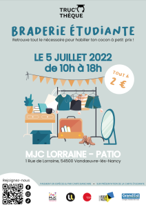 Ce mardi 5 juillet, la Trucothèque organise la dernière braderie étudiante de l'année. Retrouvez des vêtements, jeux de sociétés, livres, produits éléctroménagers, vaisselle, et déco à la MJC Lorraine de 10h à 18h.