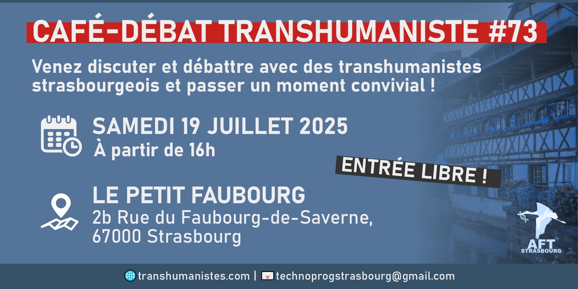 Ce mois-ci, pas de thèmes précis. Place en priorité à la convivialité. Venez nous parler de ce qui vous intéresse ou vous inquiète dans le transhumanisme et les progrès contemporains ! Qu’il s’agisse d’intelligence artificielle, d’augmentation humaine, d’amortalité, ou des aspects politiques et sociaux des nouvelles technologies, les transhumanistes strasbourgeois seront ravis de discuter ou de débattre avec vous.