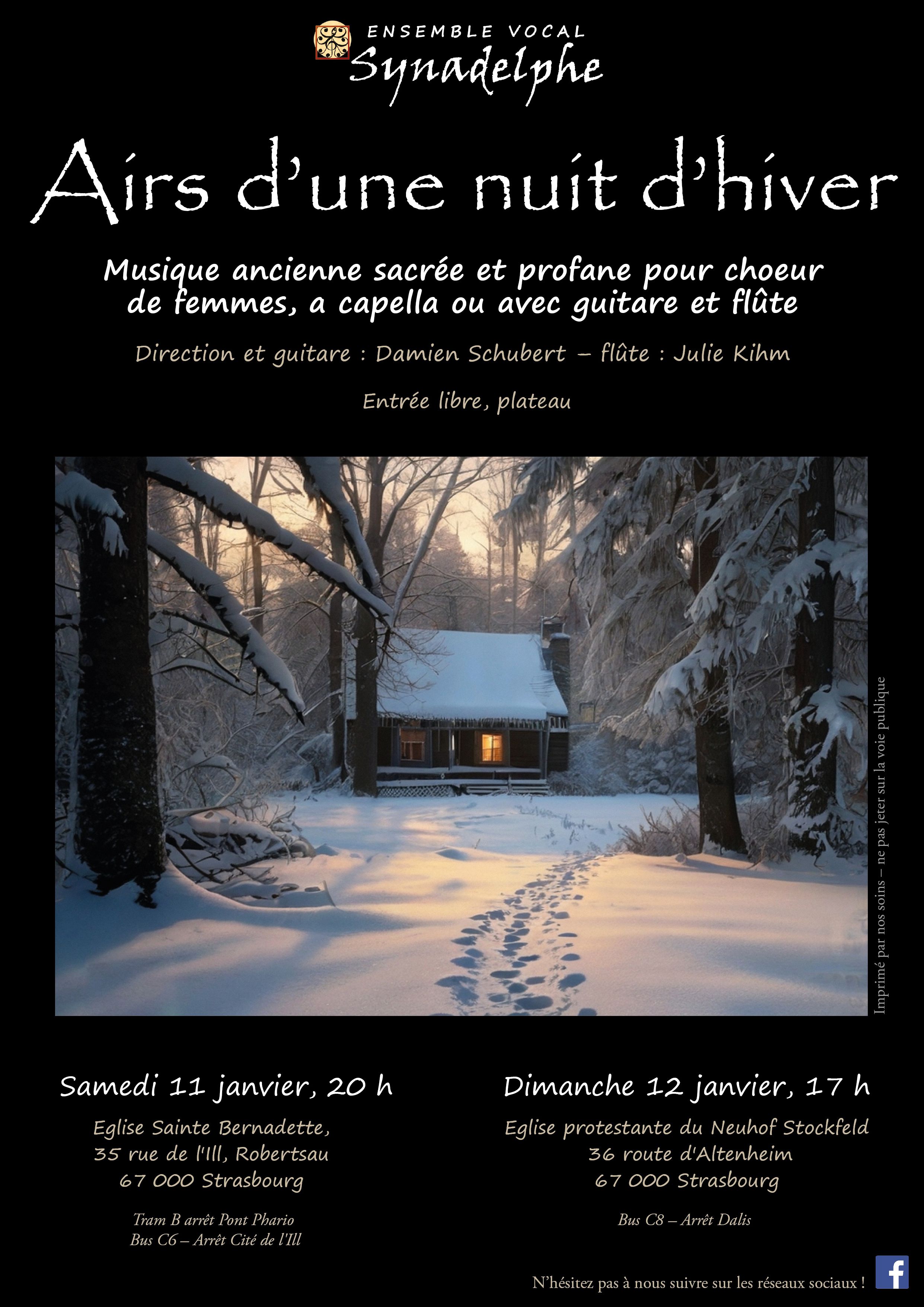 L'ensemble vocal strasbourgeois Synadelphe vous présente son nouveau programme d’hiver pour 16 voix de femmes, chanté a cappella ou avec accompagnement de guitare et flûte. Vous y entendrez des chants sacrés du Moyen-Âge, de la Renaissance et quelques chants américains du 18ème siècle.