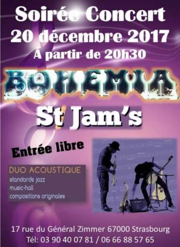 Mercredi 20/12 le Bohemia vous invite a venir découvrir le groupe ST JAMS qui vous ferons voyager a travers leur musique Jazz/Blues ainsi que de nombreuse compositions personnelles. Le concert débutera à 20h30. Venez partager un moment convivial, bonne humeur et ambiance garantie