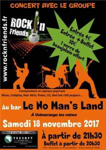 ROCK’n Friends vous propose un concert pour fêter l’arrivée du beaujolais nouveau le Samedi 18 novembre à partir de 21h30 au Bar le No mans land à Volmerange les mines. ?