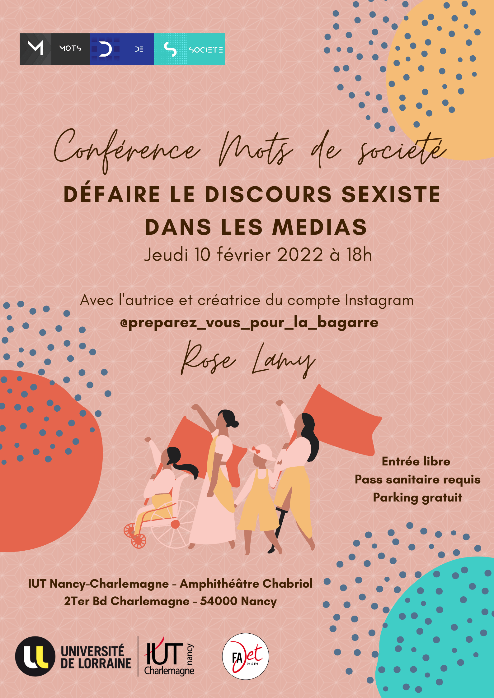 Nous sommes heureux de vous annoncer la venue de Rose Lamy, autrice de "Défaire les discours sexiste dans les médias" publié aux éditions Lattès en ... 2021 et propriétaire du compte instagram @preparez_vous_pour_la_bagarre, à l'occasion de la troisième conférence du cycle Mots De Société de cette année ! La conférence se déroulera le 10 février à 18h dans l'amphithéâtre Chabriol de l'IUT Charlemagne à Nancy. Nous vous invitons d'ores et déjà à bloquer cette date dans votre agenda !