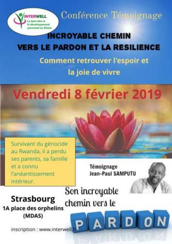 Jean-Paul Samputu vient parler de son histoire dramatique. Il a perdu sa famille, ses parents, sa soeur lors du masacre génocide au Rwanda. Il a alors du quitté son pays pour ne pas être tué. Suite à la mort de ses proches, il a été anéanti et était dans une mort intérieure. Il a vécu l’enfer intérieur pendant 9 ans jusqu’au jour où il a trouvé l’énergie de pardonner aux meurtriers et de contacter une énergie de résilience. Par exemple, son ami et voisin sera l’assassin de son père. Jean-Paul fera un chemin de guérison pour lui accorder le pardon lors d’un "Gacacca" (tribunal populaire) Aujourd’hui, il parcoure le monde pour donner des conférences et des concerts pour témoigner de son expérience de vie et de la résilience et du pardon qu ’il a contacté.