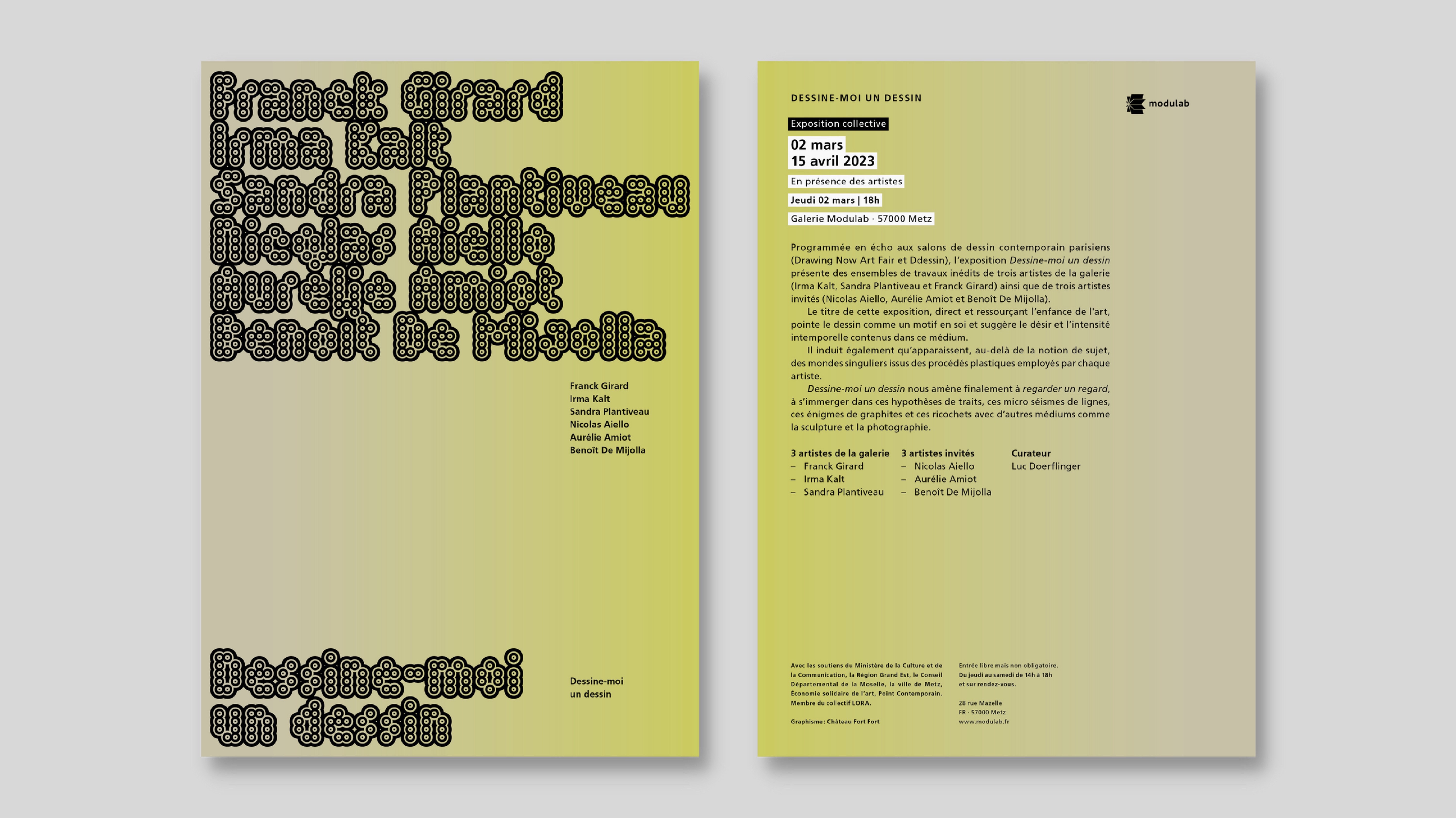 Programmée en écho aux salons de dessin contemporain parisiens (Drawing Now Art Fair et Ddessin), l’exposition Dessine-moi un dessin présente des ensembles de travaux inédits de trois artistes de la galerie (Irma Kalt, Sandra Plantiveau et Franck Girard) ainsi que de trois artistes invités (Nicolas Aiello, Aurélie Amiot et Benoît De Mijolla).