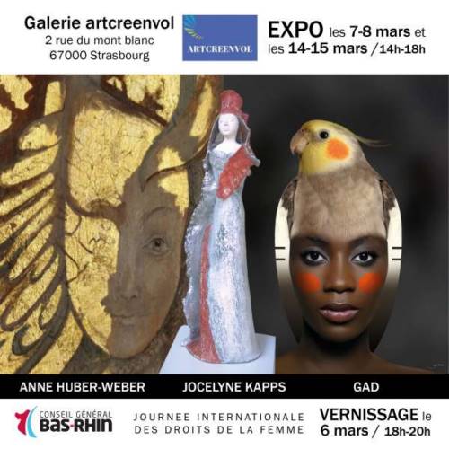 Avec des oeuvres autour de la thématique de la Femme, Gad - peintre numérique, Anne Huber-Weber - peintre plasticienne et Jocelyne Kapps - céramiste, exposeront les 7 et 8 mars de 14h à 18h et les 14 et 15 mars de 14h à 18h à la Galerie artcreenvol à Strasbourg, près de la médiathèque André Malraux.