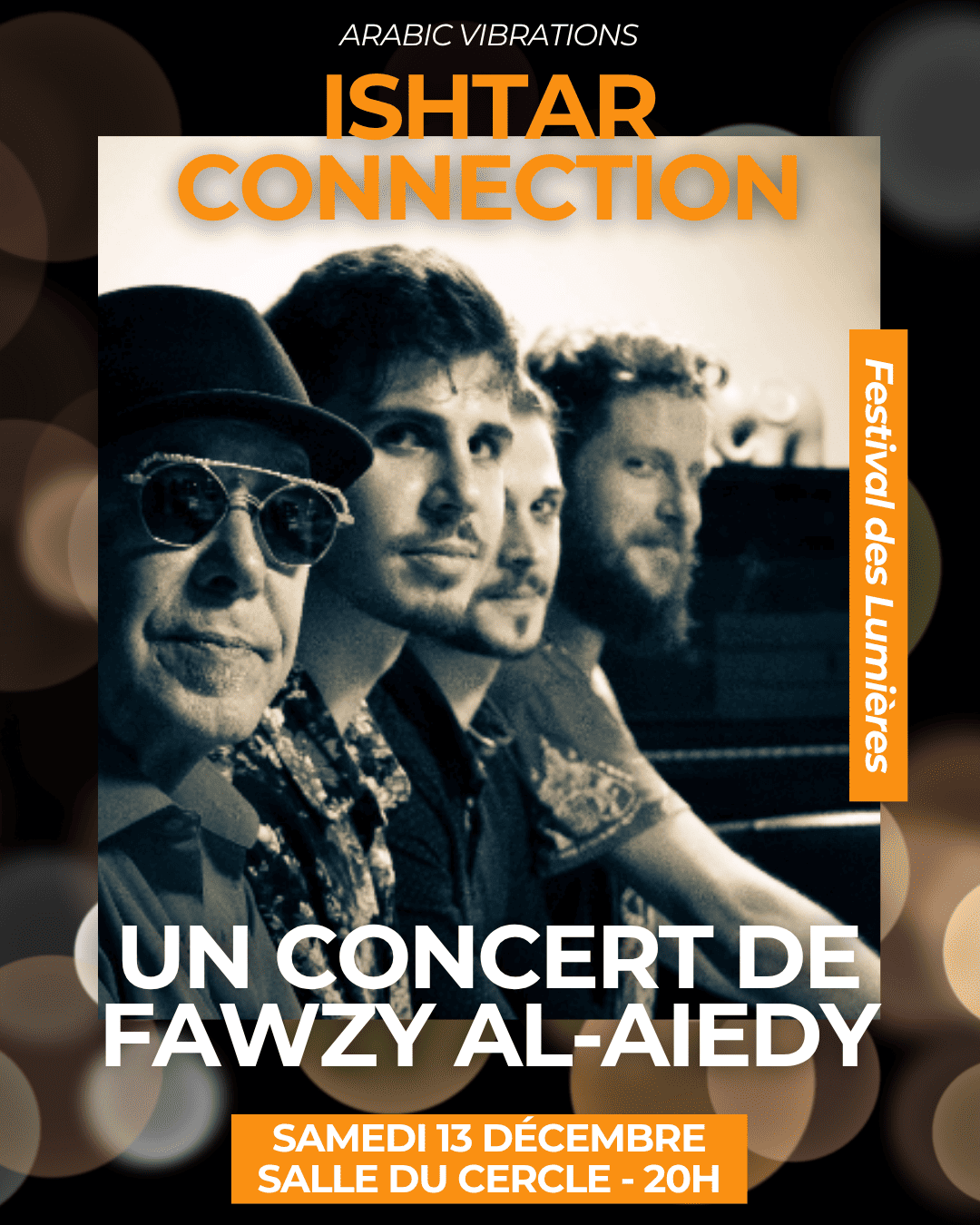 Fawzy Al-Aiedy rend hommage à la chanson arabe du Moyen-Orient et du Maghreb, revisitant ses sonorités à travers une fusion audacieuse entre musiques traditionnelles, instruments acoustiques et pulsations électroniques.Avec Ishtar Connection, les rythmes d’Irak, de Syrie, du Liban ou encore du Maroc dialoguent avec des textures modernes dans une alchimie irrésistible entre Orient et Occident.