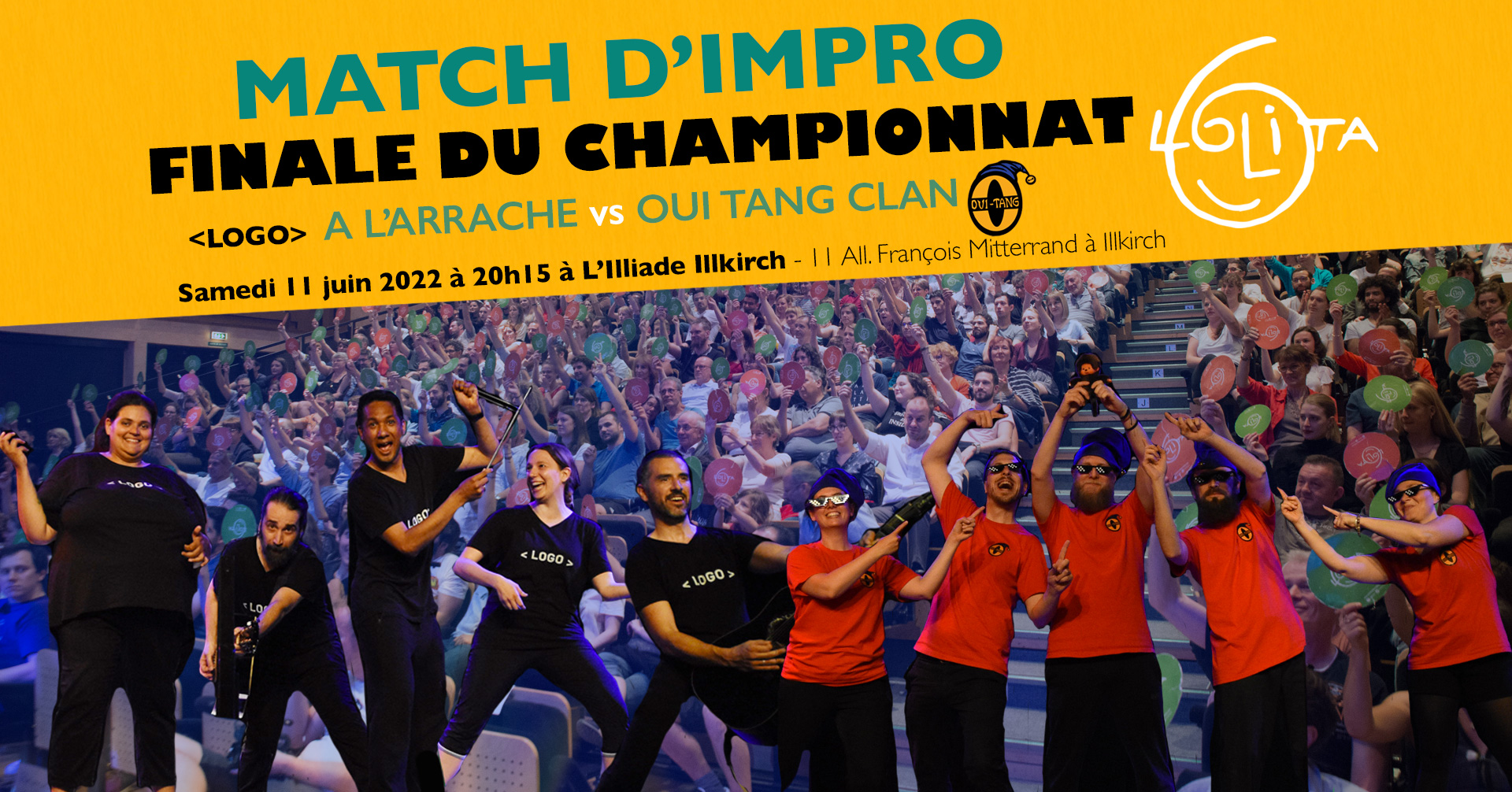 On y est!! Après toute une saison de matchs d’impro depuis le mois de décembre 2021 : 10 matchs de série, 2 demi-finales, voici venu l’heure de la Graaaande Finale du Championnat de théâtre d’impro Lolita! Sortez les trompettes, les 2 équipes du soir vont tout donner pour remporter le trophée Lolita qui n’a pas connu de nouveau propriétaire depuis la dernière finale en date en 2019! Ça commence à faire 3 ans tout ça! Et cette année les 2 équipes qualifiées sont : (roulement de tambour) À l’Arrache et Oui Tang Clan!