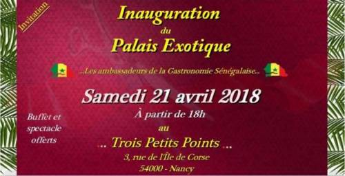 Vous êtes tous conviés à l’inauguration du Restaurant Gastronomique " Le Palais Exotique" le Samedi 21 avril 2018 au Trois Petits Points 3, rue de l’Île de Corse 54000 - Nancy. à partir de 18 h un buffet suivi d’un spectacle concert seront offerts par la maison. Le rendez-vous des gourmets au palais fin. Faîtes passer l’information autour de vous. L’accès est bien sûr libre. Au plaisir de vous accueillir.