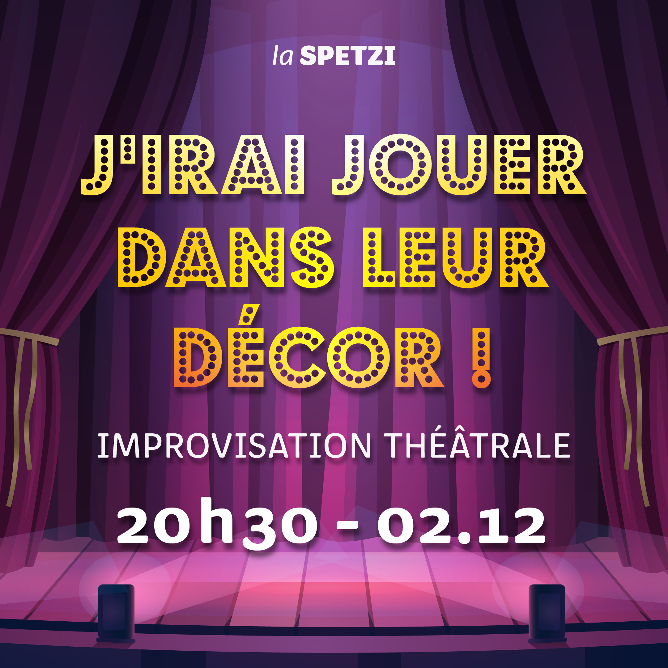 Les comédiens et comédiennes d'improvisation de La Spetzi se lanceront dans une aventure théâtrale unique pour le spectacle "J'irai jouer dans leur décor". Ils découvriront le soir-même le décor de la pièce "Tailleur pour dames", prêté le jour de relâche par la compagnie Les Comédiens du Rhin, et s'en inspireront pour improviser une pièce d'environ une heure. Mais ce qui rend le spectacle vraiment spécial, c'est que c'est le public qui aura le pouvoir de façonner l'histoire. Vous pourrez décider de l'interprétation du décor, des relations entre les personnages, de leur métier, de leurs caractéristiques... Tout sera entre vos mains !
