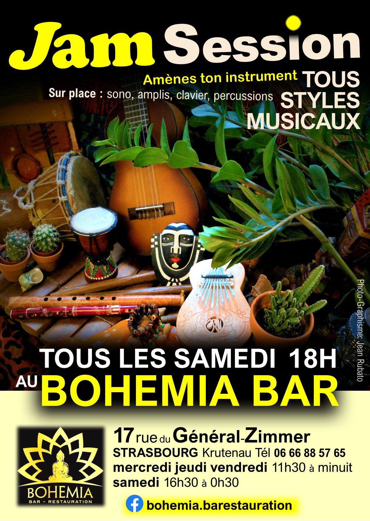 Jam session tous styles musicaux, tous les samedi. Sur place : sono, amplis, clavier, percussions.
