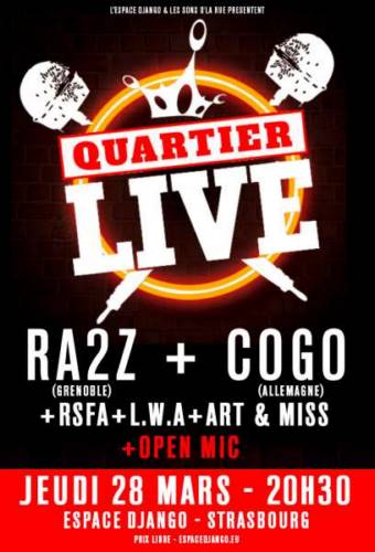 Le “Live SDLR” se produira à l’Espace Django dans le cadre de leur événement “Quartier Libre” et devient “Quartier Live”. À l’occasion de cette soirée nous vous proposons quatre groupes prometteurs qui commencent à se faire un nom dans le milieu : Cogo, RSFA, L.W.A et le collectif 100% féminin des Sons D’la Rue, Art & Miss. Sera également présent un invité surprise venu de Grenoble, le rappeur Ra2z. Sans oublier pour les artistes les plus courageux dans la salle, la possibilité de s’essayer entre chaque passage à l’Open Mic.