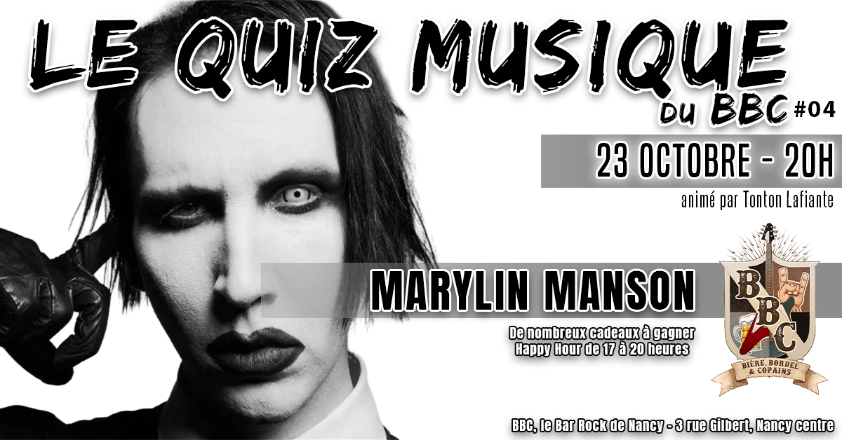 ⚡ Jeudi 23 octobre à 20h, le BBC t’invite à explorer l’univers de l’Antichrist Superstar. Anecdotes croustillantes au menu : savais-tu que Brian Warner a choisi son nom de scène en mixant les noms de deux célébrités ? Ou qu’il a déjà fait flipper la moitié de l’Amérique juste en s’habillant en prostituée pour aller chercher son pain ? Bref, prépare-toi à au moins 15 questions aussi tordues que ses mises en scène.