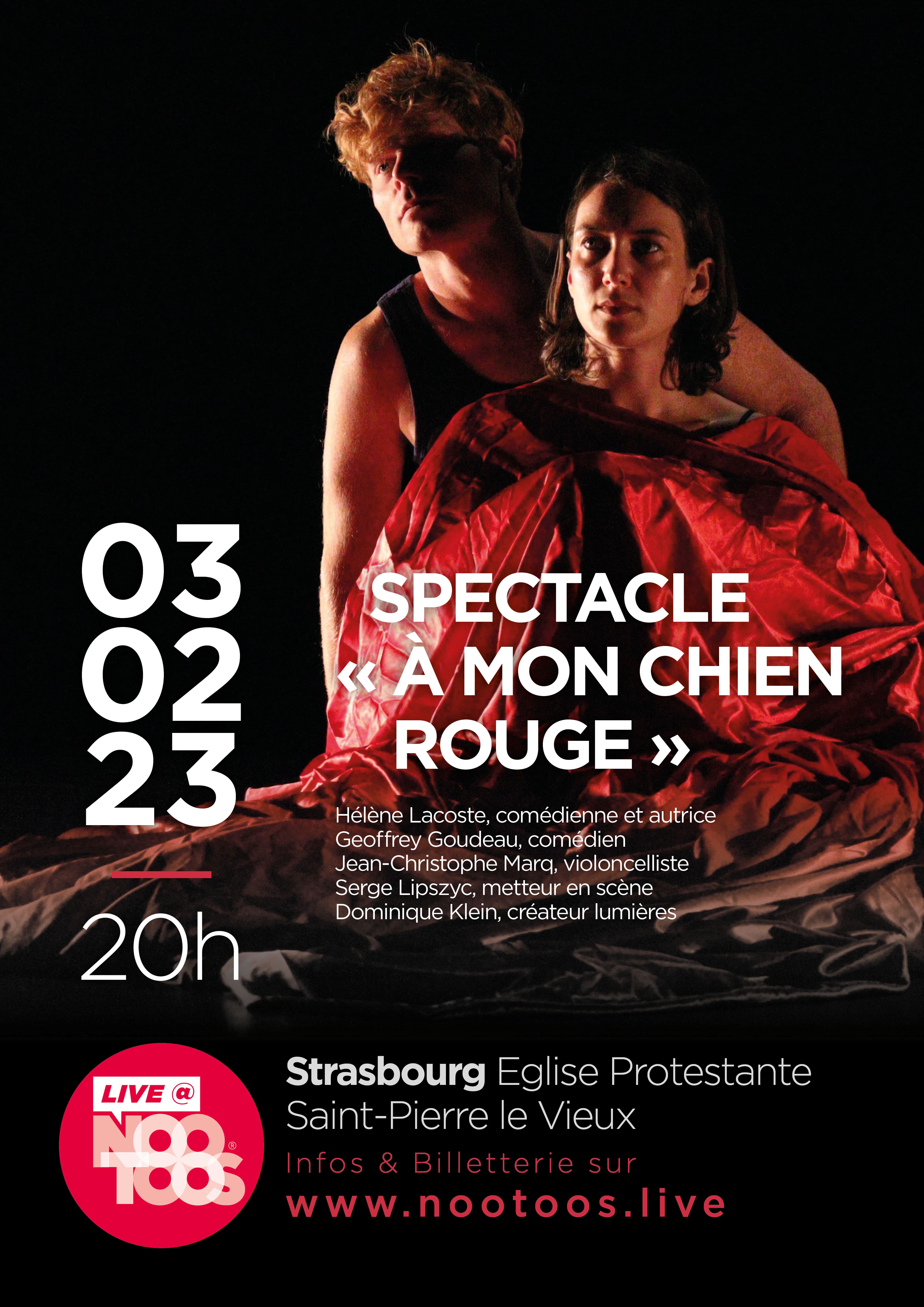 Live@Nootoos propose une pièce de théâtre intitulée "À mon chien rouge" le vendredi 3 février à 20h à l'église protestante Saint-Pierre le vieux // NooToos. Le couple, l'animalité, l'impossibilité de se rencontrer dans la nuit de la chambre, et pourtant ce désir intarissable de n'être plus qu'un, de s'attacher l'un à l'autre jusqu'au début du jour.