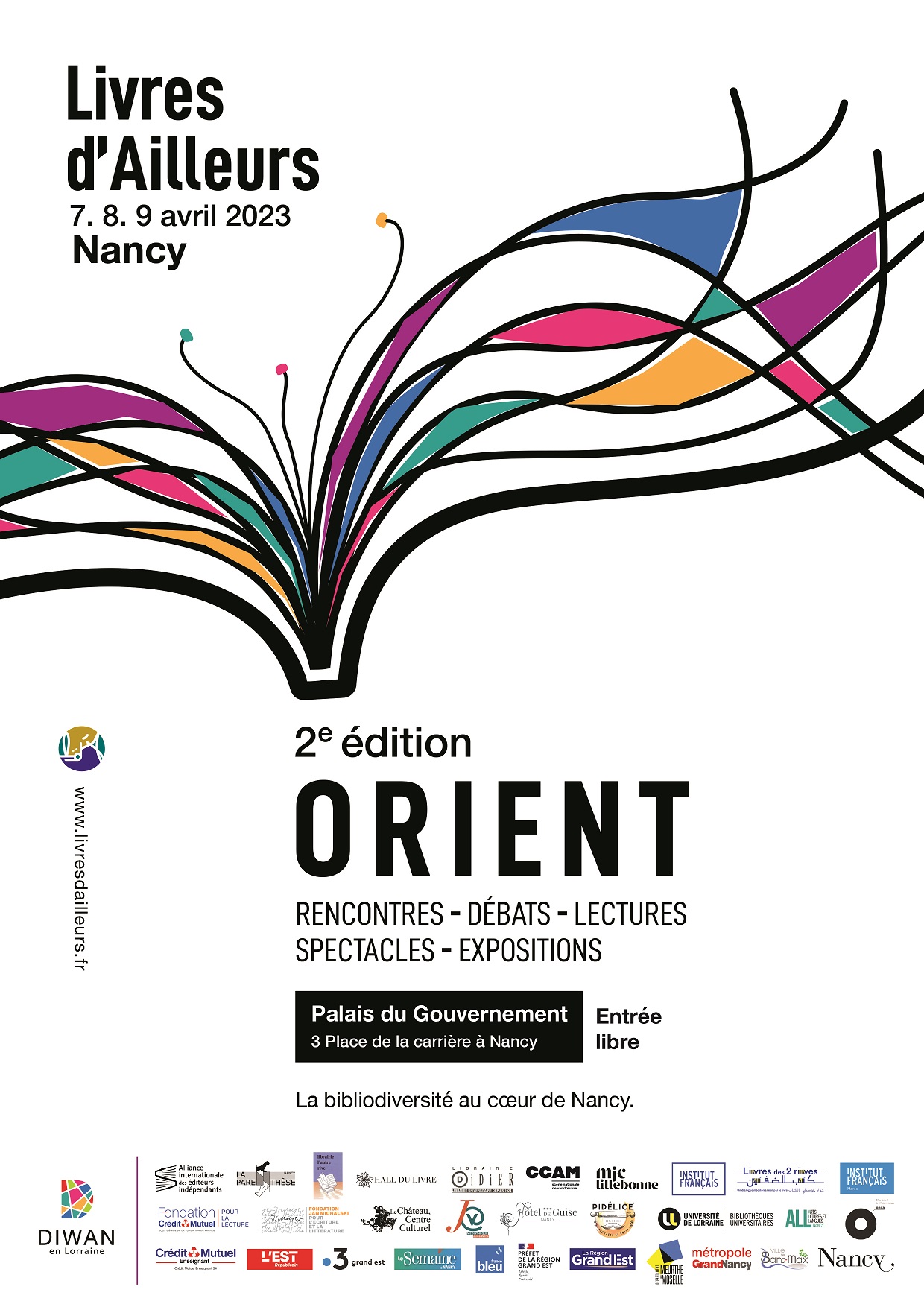 Livres d’Ailleurs est une manifestation littéraire ayant pour but de faire connaître et rayonner la bibliodiversité. Son objectif final est de devenir un rendez-vous international annuel attendu, ouvert et inclusif. Après une édition sur l’Afrique en 2022, le salon s’invite au Palais du Gouvernement de Nancy pour faire rayonner les littératures d’Orient. Il se déroulera du vendredi 7 au dimanche 9 avril et accueillera 34 crivains, bédéistes, illustrateurs, poètes, auteurs jeunesse, novellistes... venus d'Inde, d'Iran, de Turquie, de Syrie, de Jordanie, du Liban, de Palestine ...