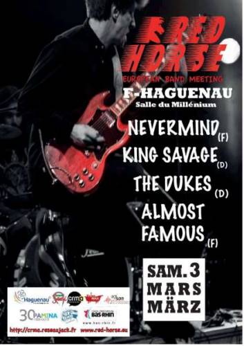 A l’occasion de la 3ème édition du Red Horse Festival – festival de rencontres et d’échanges entre musiciens européens - qui aura lieu du 18 au 21 mai 2018 à Stutensee (banlieue de Karlsruhe), le CRMA Bas-Rhin Nord, partenaire de l’évènement, organise un concert franco-allemand le 3 mars 2018 à 20h, salle du Millénium à Haguenau. Au programme, 4 groupes allemands et français ainsi que l’objectif de favoriser davantage les échanges entre les artistes pour prolonger la rencontre déjà permise par le festival en juin 2017. Ce sera aussi l’occasion pour les jeunes musiciens âgés de 16 à 25 ans de s’inscrire pour la nouvelle édition du Red Horse Festival 2018.