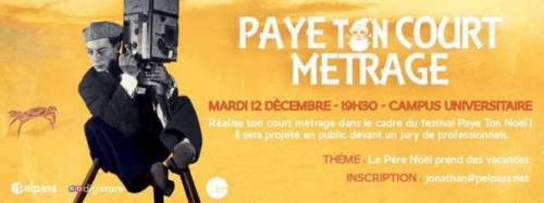 Comme chaque année, Paye Ton Noël propose un concours de court-métrage ouvert à tous. Les courts-métrages seront projetés le 12 décembre devant un jury de professionels sur le Campus Central et de nombreux lots sont à gagner !