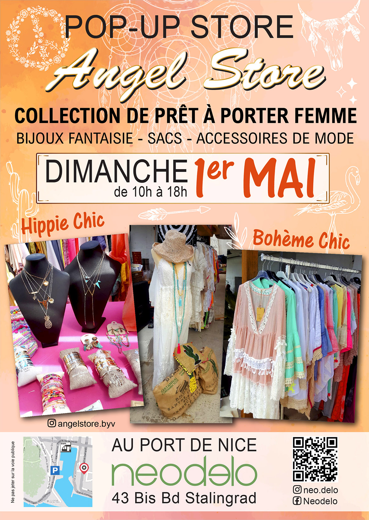 Angel Store nous propose lors de ce pop-up store dimanche 1er mai à NEODELO, au port de Nice, sa collection de prêt à porter Femme, des bijoux fantaisie, sacs et accessoires de mode. Un style Hippie Chic et Bohème Chic, de belles pièces pour être au top cet été !