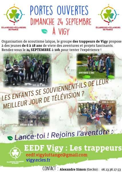 Organisation de scoutisme laïque, le groupe des trappeurs de Vigy propose à des jeunes de 6 à 18 ans de vivre des aventures et projets fascinants. Rendez-vous le 24 SEPTEMBRE à 10h. N’hésitez pas à partager à tous cet évènement ou tous les intéressés et les curieux seront accueillis avec joie.