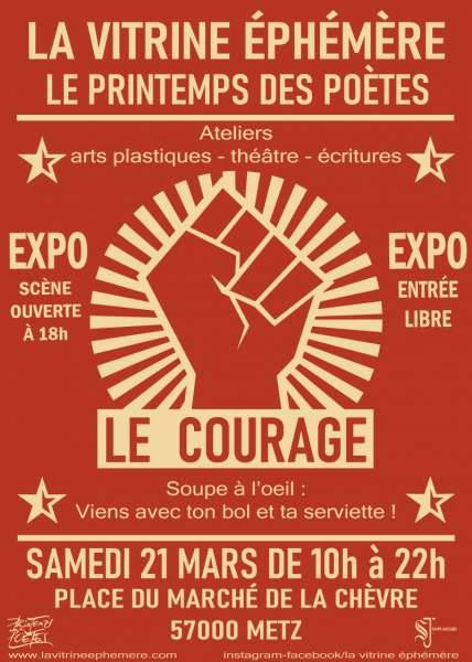 Le Printemps des Poètes édition 2020 (thème: Le Courage), c’est un peu partout en France du 7 au 23 mars. A cette occasion, toute la journée du samedi 21 mars, La Vitrine éphémère vous propose, en plus de son exposition permanente (mais changeante), des ateliers Arts Plastiques, Théâtre et écritures !