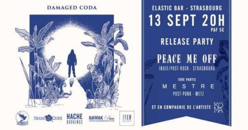 Peace Me Off t’invite à venir fêter la sortie de leur nouvel EP “Damaged Coda” à L’elastic Bar, avant de partir en tournée sur les routes de France et d’Espagne du 20 septembre au 03 octobre 2018. L’ouverture se fera en compagnie du groupe post-punk messino-strasbourgeois Mestre band !