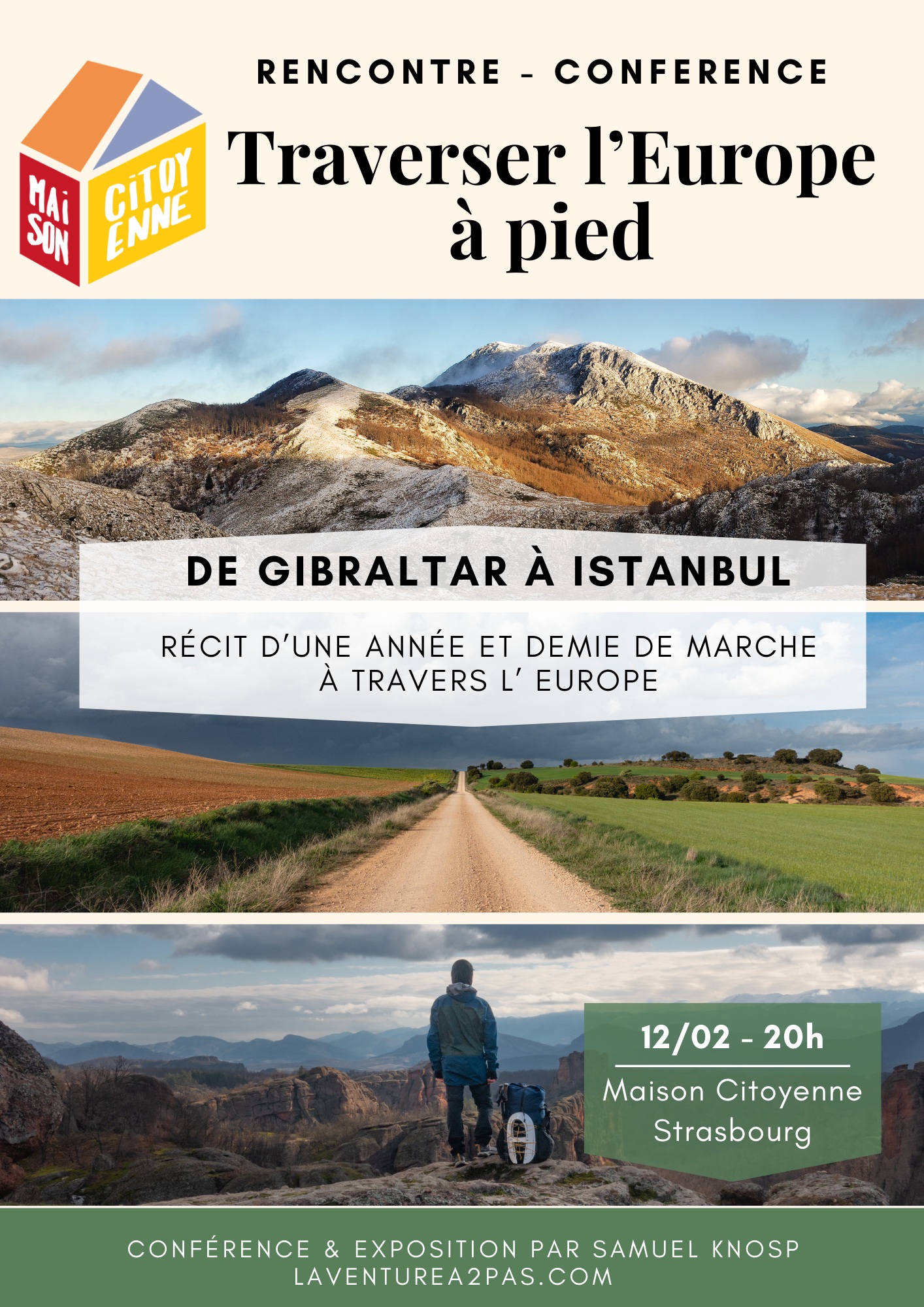 Je vous invite à la Maison Citoyenne pour partir à l'aventure dans une longue marche itinérante ! Parti du détroit du Gibraltar, j'ai marché pendant 18 mois à travers l'Europe pour rejoindre Istanbul à l'autre bout du continent. De l'Espagne à la Turquie en passant par les Alpes et les Balkans, j'ai ainsi traversé 10 pays et les 4 saisons au rythme de mes pas. Marcher et vivre dehors ont été mon mode de vie et ma manière de m'intéresser au monde, dans cette expérience intérieure, humaine et sportive. Je vous invite à partir ensemble parler de la beauté de la marche au long court, des régions que j'ai traversées avec passion, des multiples facettes de la solitude, du confort d'avoir peu, et surtout de la possibilité infinie de s'émerveiller et vivre des aventures autour de nous !