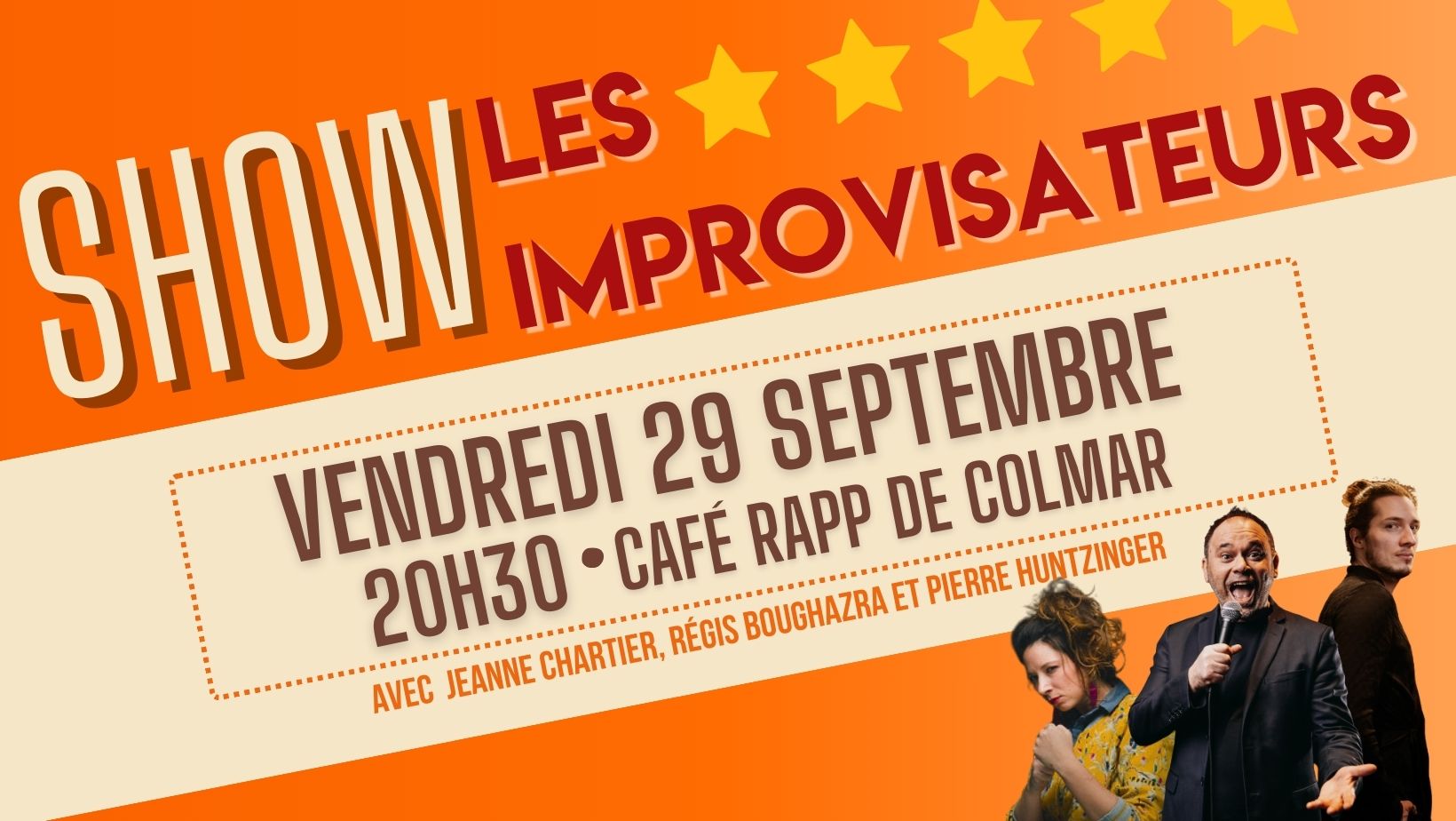 Le vendredi 29 septembre à 20h30 au Café Rapp à Colmar, retrouvez le fameux show humoristique totalement improvisé des Improvisateurs avec Pierre Huntzinger, Jeanne Chartier et notre incontournable maître de cérémonie Régis Boughazra.