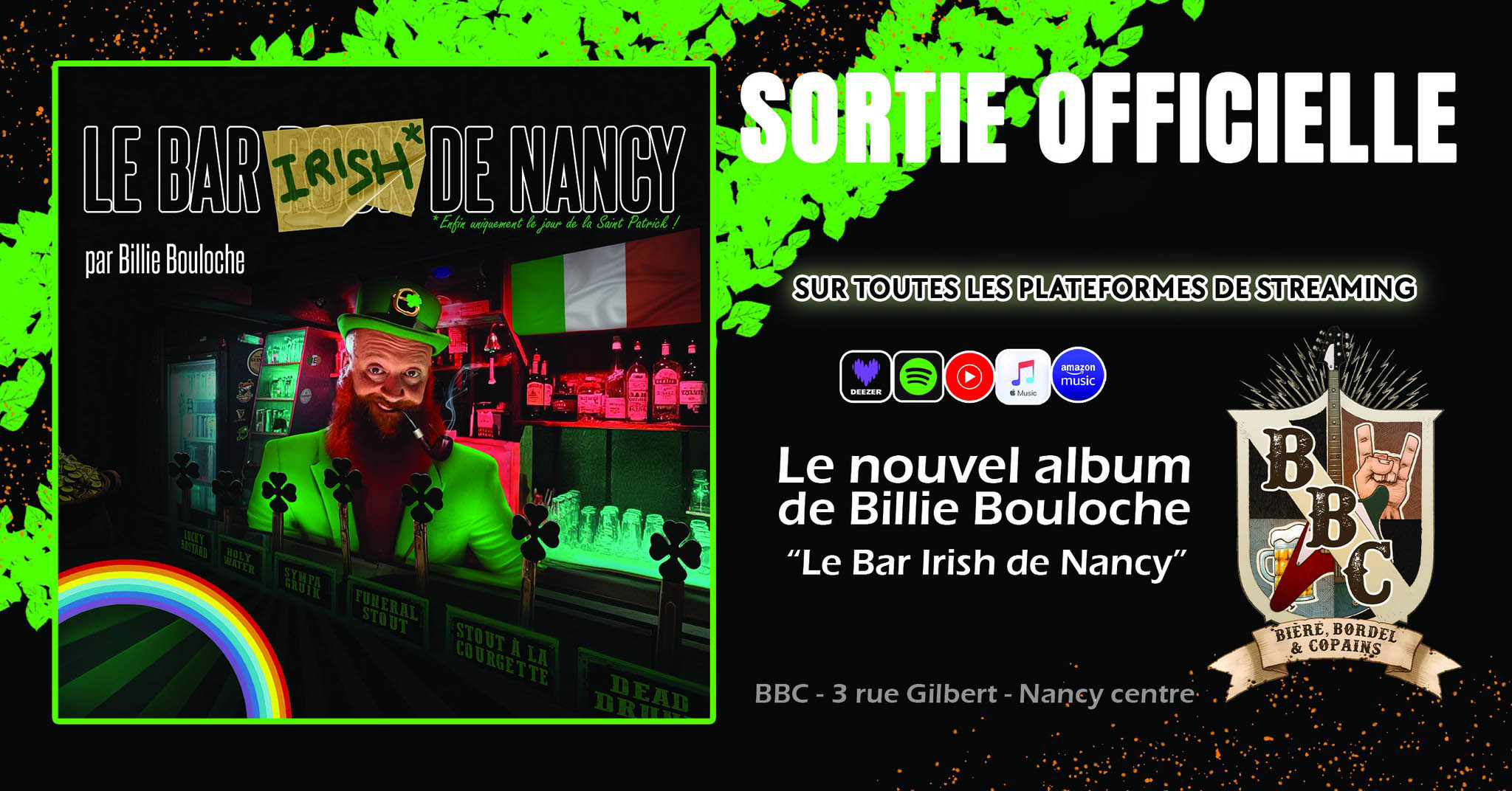Le 13 mars, prépare tes oreilles et ton foie : le nouvel album de Billie Bouloche, Le Bar Irish de Nancy, débarque officiellement sur toutes les plateformes de streaming.