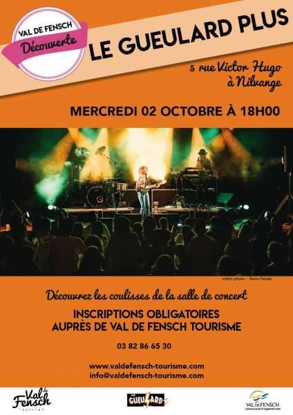 Envie de découvrir les coulisses d’une salle de spectacles - De monter sur scène - C’est possible grâce à Val de Fensch Tourisme, le mercredi 02 octobre à 18h00 ! Partez pour une découverte de la salle de musiques actuelles de Nilvange, «le Gueulard Plus» qui accueille chaque année des artistes confirmés ou en devenir, sur scène ou dans ses trois studios d’enregistrement.