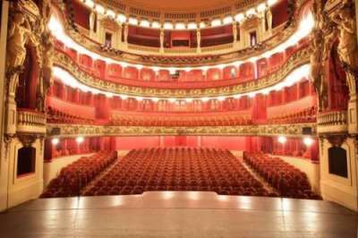 Salle de 1014 places aux tons rouges/or/blancs avec stucs, balcon et galeries pour des opéras classiques.