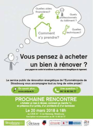 Découvrez les bons réflexes à avoir de la recherche à l’acquisition d’un bien grâce aux conseils d’un juriste, d’un architecte et d’un technicien en participant à la conférence organisée par l’association Eco-Quartier Strasbourg mardi 20 mars 2018 à 18h Au CAUE du Bas-Rhin - 5 rue hannong - 67000 Strasbourg.