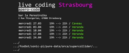 Autour d’une bière, venez découvrir le live-coding, Cette discipline vous permettra de coder la volée de la musique mélangeant ainsi improvisation et composition algorithmique. Comme toujours, prix libre et nous mettons à disposition les cables et la sono, nous prévenir si vous avez besoin d’un ordinateur portable. Nous utiliserons entre autres le programme « Sonic-Pi » un solution légère, open-source, multi-plateforme écrite pour pouvoir fonctionner sur une Raspberry Pi (également utilisable sous windows, Mac OSX et linux). Pour les prochaines sessions nous ouvrons également à d’autres langages, particulièrement foxDot mais nous restons ouverts à d’autres propositions.