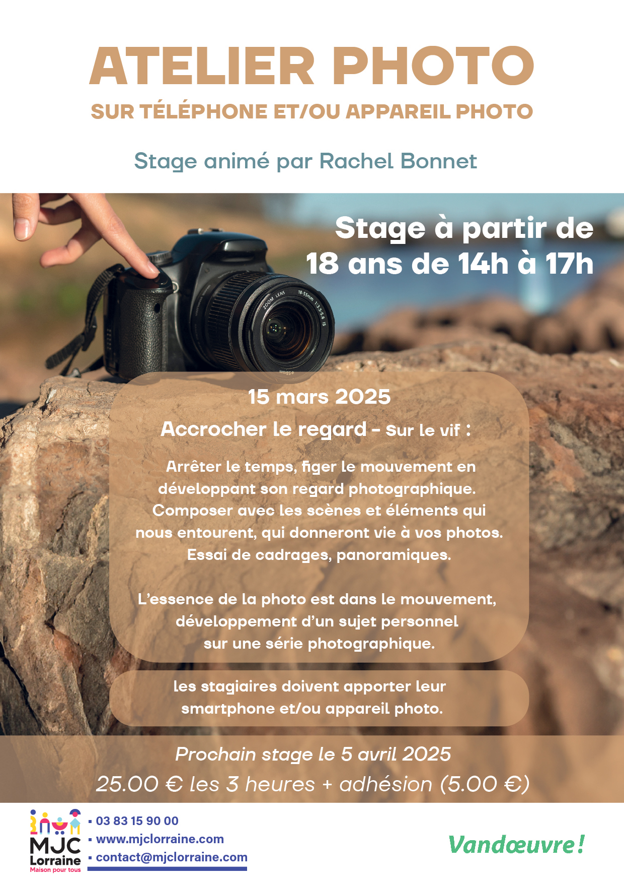 Rachel Bonnet vous propose une série d’ateliers pour explorer différentes approches de la photographie et affiner votre regard. À travers des exercices pratiques et des conseils techniques, chaque séance abordera un thème spécifique pour vous aider à capturer des images percutantes et expressives.