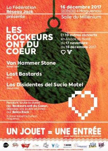 Comme les années précédentes, le concert final aura lieu au Millénium de Haguenau le 16 décembre 2017 à partir de 20h. Cette année le groupe Van Hammer Stone ouvrira les festivités avec son show de Stoner Rock explosif travaillé lors d’une résidence au Millénium au mois d’octobre. Le groupe strasbourgeois Lost Bastards viendra ensuite défendre son premier album de Heavy Rock intitulé « Face the sun » sorti le 2 novembre dernier. Enfin, ce sont les célèbres Los Disidentes del Sucio Motel, qui, après avoir foulé la scène du Hellfest au mois de juin, viendront présenter les titres tirés de leur dernier et troisième album très Rock Metal « Human Collapse ». Le groupe, fondé à Bischwiller, présentera pour l’occasion le concert vidéo qu’il a conçu lors d’une résidence au Millénium en février 2017.
