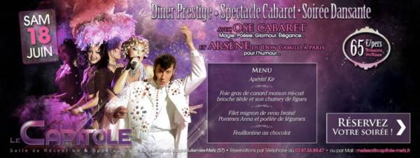 Ose cabaret et Arsène vont vous transporter dans un tourbillon de paillettes et de magie lors de cette soirée au Capitole. Vous dinerez confortablement installés en admirant ce show Chic Glamour et Elégant.
