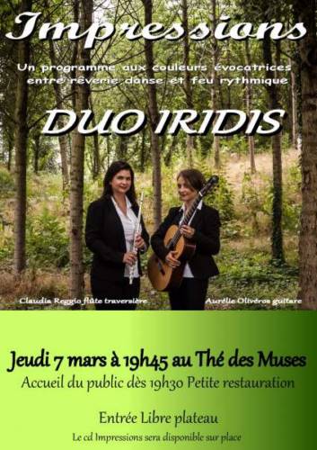 Venez profiter d’un moment de convivialité autour d’un bon thé en savourant les sonorités colorées du programme proposé par le Duo Iridis composé de Claudia Reggio à la flûte traversière et Aurélie Olivéros à la guitare.