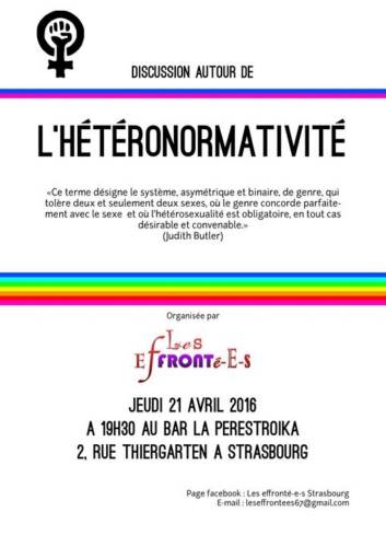 L’association féministe Les Effronté-e-s vous invite à une discussion sur la notion d’hétéronormativité, concept à la base des discriminations envers les personnes LGBT+