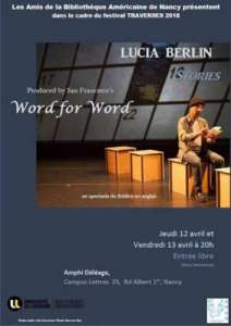Comme chaque année, les Amis de la Bibliothèque Américaine de Nancy, vous invitent à assister à une représentation théâtrale en anglais autour des nouvelles de Lucia Berlin, jeudi 12 et vendredi 13 avril 2018. Cette pièce de théâtre est produite et interprétée par la troupe californienne Word for word.