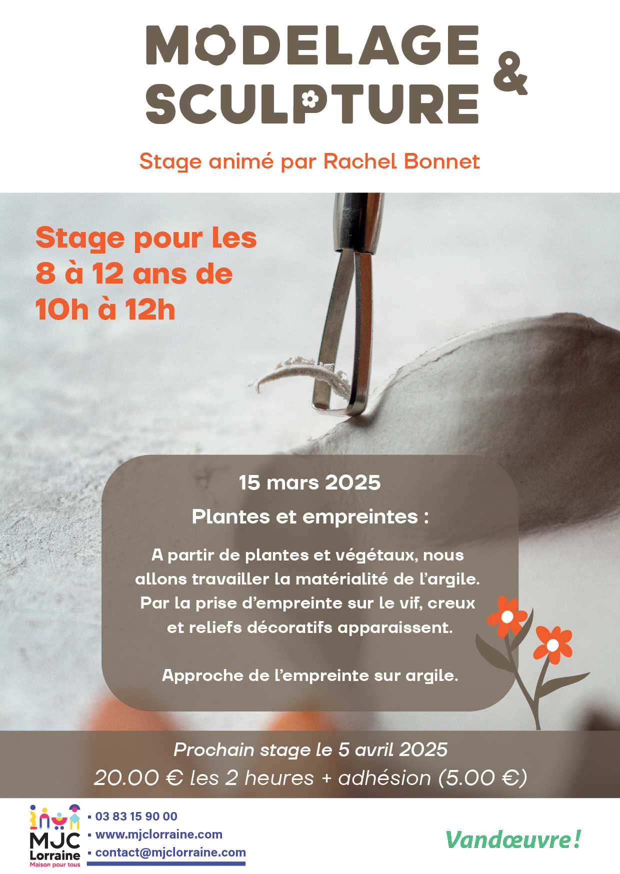 Rachel Bonnet propose une série de stages pour initier les enfants au modelage et à la sculpture. À travers différentes thématiques, ils découvriront le plaisir de travailler la terre et d’exprimer leur créativité en façonnant des formes uniques.