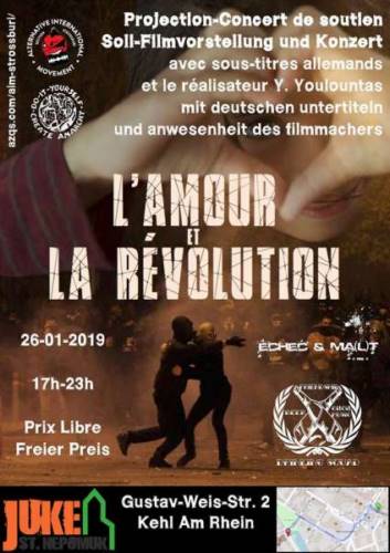 Cette année 2019, le 26 janvier, l’AIM Strossburi revient au JUKE Events de Kehl à 5 minutes de la station de tram Rathaus; pour une Projection-Concert de soutien avec des sous-titres allemands et la présence du réalisateur Yannis Youlountas.