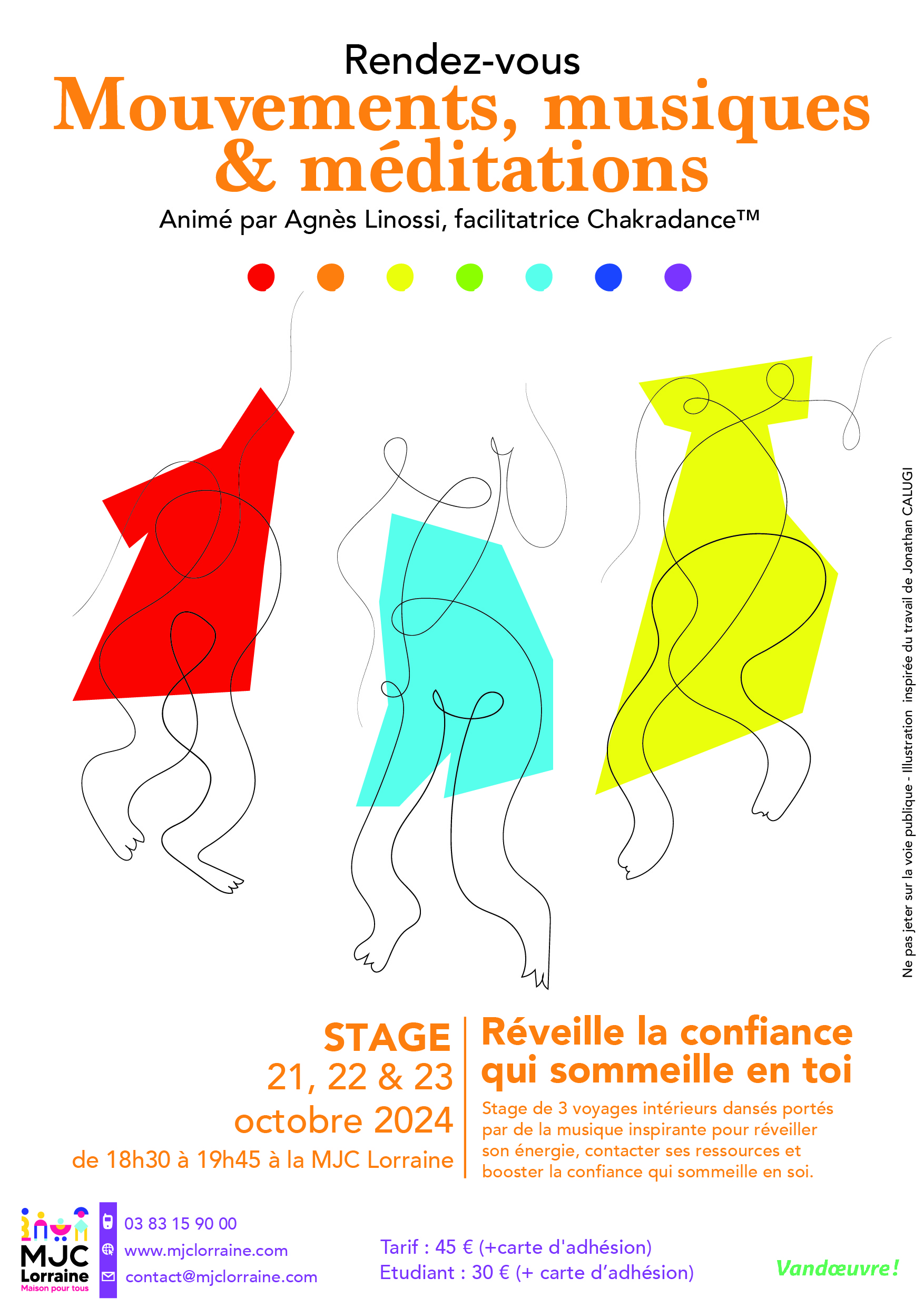 Stage de Toussaint animé par Agnès Linossi « Réveille la confiance qui sommeille en toi » (21-22-23 octobre 2024) : stage de 3 voyages intérieurs dansés portés par de la musique inspirante pour réveiller son énergie, contacter ses ressources et booster la confiance qui sommeille en soi.