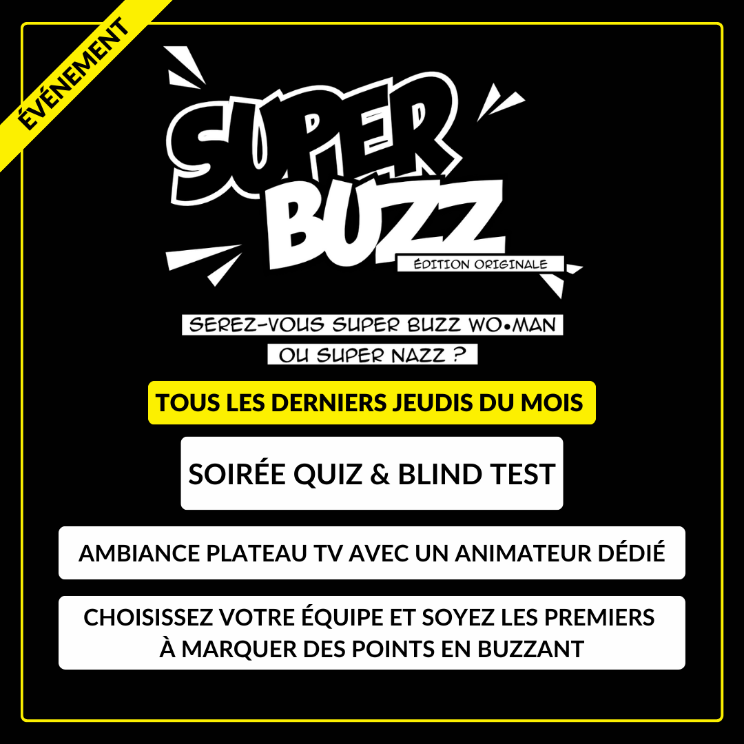 ✨ Joignez-vous à nous pour une soirée Super Buzz, où votre culture, votre sens de l’observation, votre logique et votre rapidité seront mises à l’épreuve dans l’arène du quiz et du blind test! ??